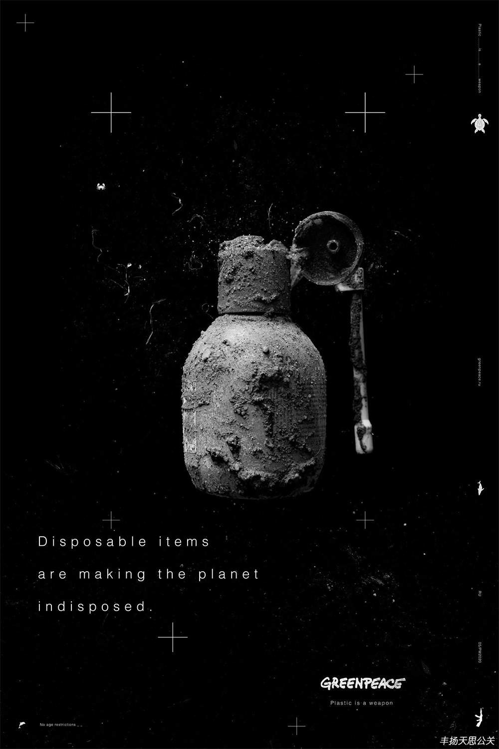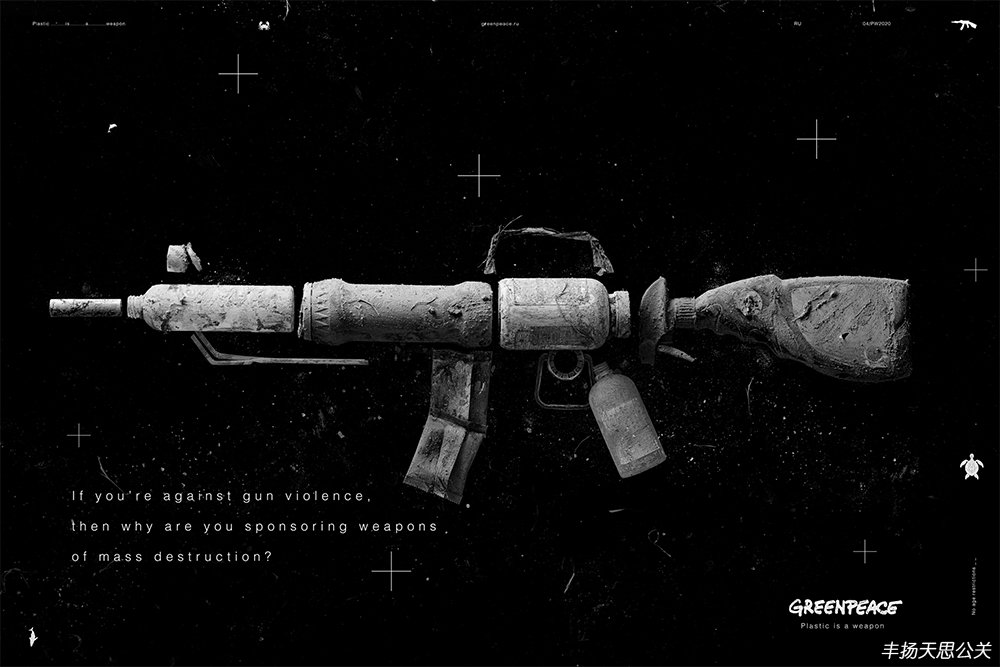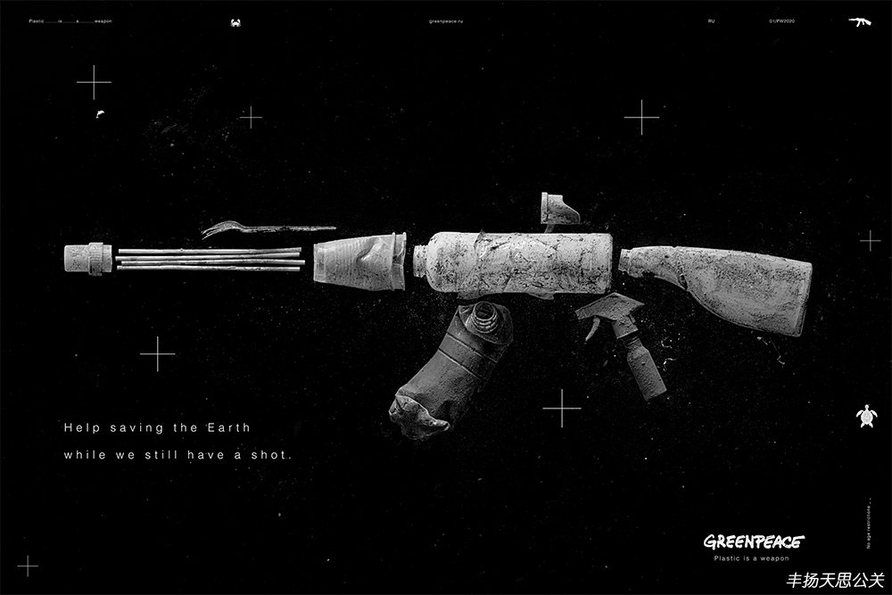 畫面中,由一次性紙杯、包裝瓶、吸管等廢棄塑料制品組成槍支武器的形狀作為主視覺元素,黑白色調的畫面配上字字戳心的文案烘托出壓抑的氣氛,再次用恐怖訴求的表現手法強調了塑料制品對環境的危害,以此提倡人們減少塑料制品的使用,不要成為殺害地球的劊子手。