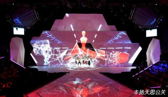 以六邊形為主要元素的舞臺參考上做了變化,使這些六邊形不是規則的平面,而是立體起來,形成鉆石切割面般的效果,讓時尚感自然流露。同時,立體化之后的六邊形組合和凸出的棱角更適合進行結構投影,讓裸眼3D效果更顯著。