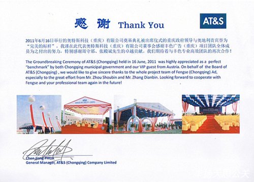 奧特斯科技(重慶)有限公司奠基典禮被出席儀式的重慶政府領導與奧地利貴賓譽為“完美的標桿”。我謹在此代表奧特斯科技(重慶)有限公司董事會感謝豐楊天思廣告(重慶)項目團隊全體成員為之付出的努力,特別感謝周守邠,張殿斌先生的卓越貢獻。我們期待著與豐揚天思專業高效團隊的再次合作!