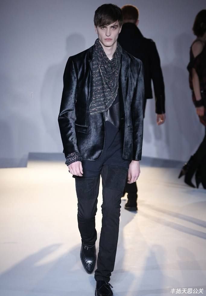 簡(jiǎn)陋的混凝土空間和照明,襯托服裝的堅(jiān)硬感與熟悉感。黑色皮革機(jī)車外套、標(biāo)志性的格子圖案,絲綢及花呢材質(zhì)等讓人聯(lián)想到“朋克”。整個(gè)系列的特殊之處在于精致細(xì)小的金屬鏈,成為男女裝的聯(lián)系點(diǎn),既有堅(jiān)硬又伴隨柔軟的雙重內(nèi)涵。